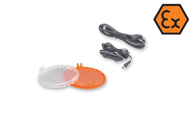 Lieferumfang: Handscheinwerfer, Ladegerät (IP20 / 230V AC bzw. 12/24V), Ladekabel 230V, Ladekabel 12V/24V, 2 Vorsteckscheiben (klar + orange). Bitte beachten: Ladestation ist nicht ex-geschützt und muss ausserhalb des EX-Bereichs betrieben werden.