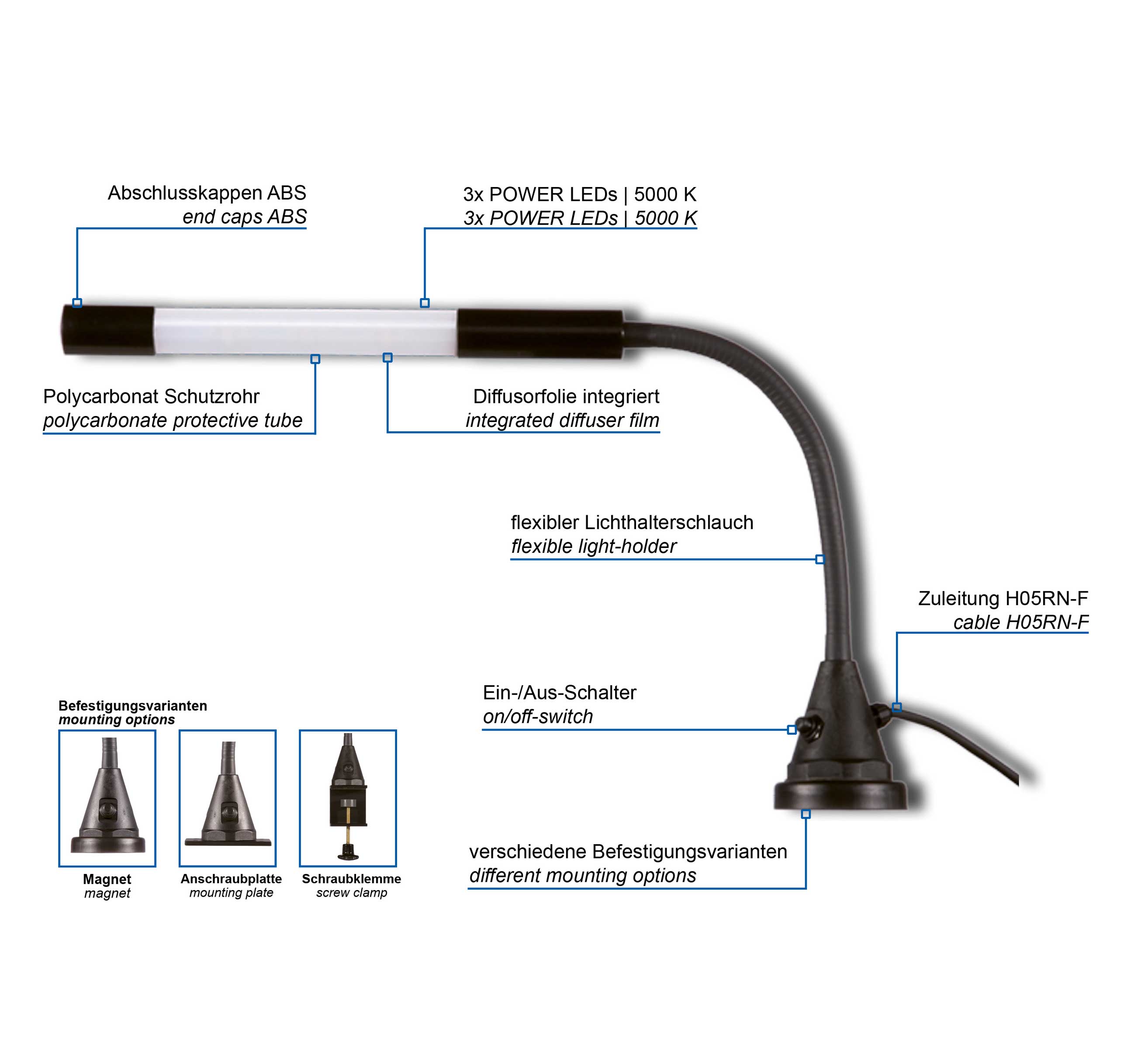 Flexible Ausrichtung dank Lichthalterschlauch in 300, 400 oder 500 mm Länge