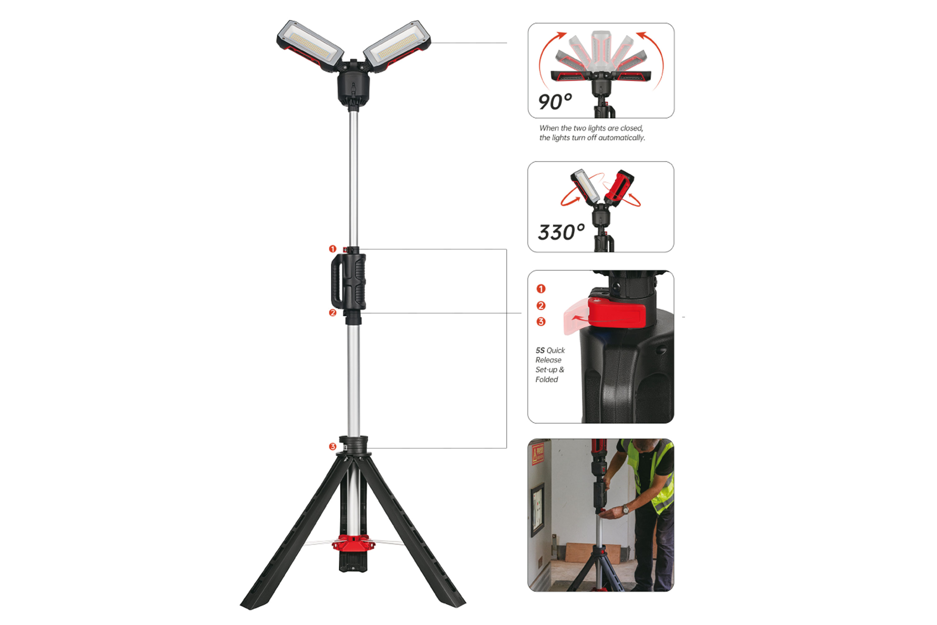- Leistung: 2 x 25W LED, 90° schwenk- und 330° drehbar